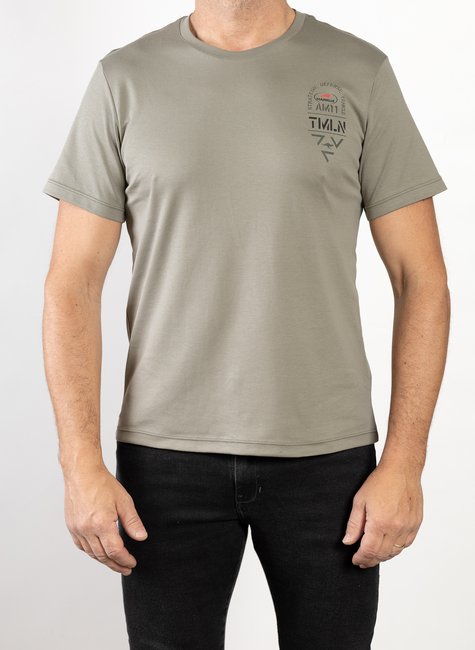 Camiseta verde militar Agrale Marruá x Time Line, com design minimalista e cheio de significado. Na parte frontal, traz o conjunto de logos Marruá, AM11 e TMLN, acompanhados da inscrição Strategic Defense Company e símbolo do canguru, todos em acabamento que combina tons de verde e destaque sutil em vermelho.